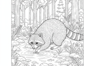 森の小川で手を洗うアライグマのぬりえ【無料ダウンロード】