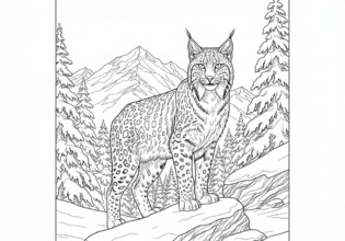 雪山の岩場に立つオオヤマネコのぬりえ【無料ダウンロード】