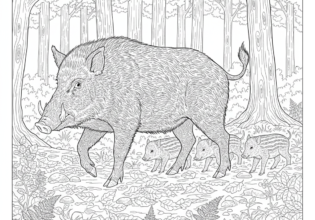森の中を歩くイノシシのぬりえ【無料ダウンロード】