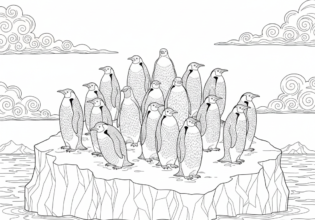 氷山の上に立つペンギンの群れのぬりえ【無料ダウンロード】