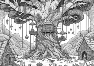 魔法の森のツリーハウス塗り絵|大樹に暮らす妖精たちの隠れ家