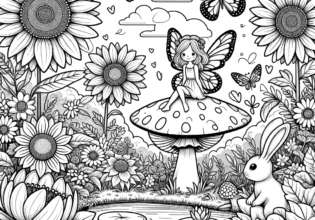 ひまわり畑の妖精塗り絵|蝶とうさぎが遊ぶメルヘンガーデン