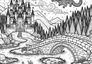 ドラゴンと古城の塗り絵|石橋を渡る先に広がるファンタジー王国