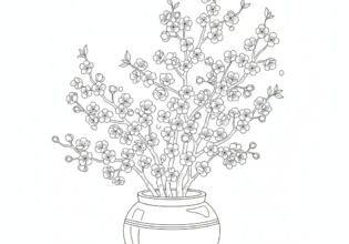 桜の枝と和風壺のぬりえ【無料ダウンロード】