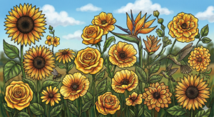 夏は、エネルギーを感じる花がたくさん!代表格はやっぱりひまわりでしょう。黄色とオレンジ、そして茶色のコントラストは塗っていて元気が出ます。