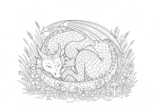 向かい合う2匹のドラゴンを描いた塗り絵です。互いを見つめ合う姿は、戦いの前なのか、それとも絆で結ばれた仲間なのか。想像が膨らむドラマチックな構図の作品です。