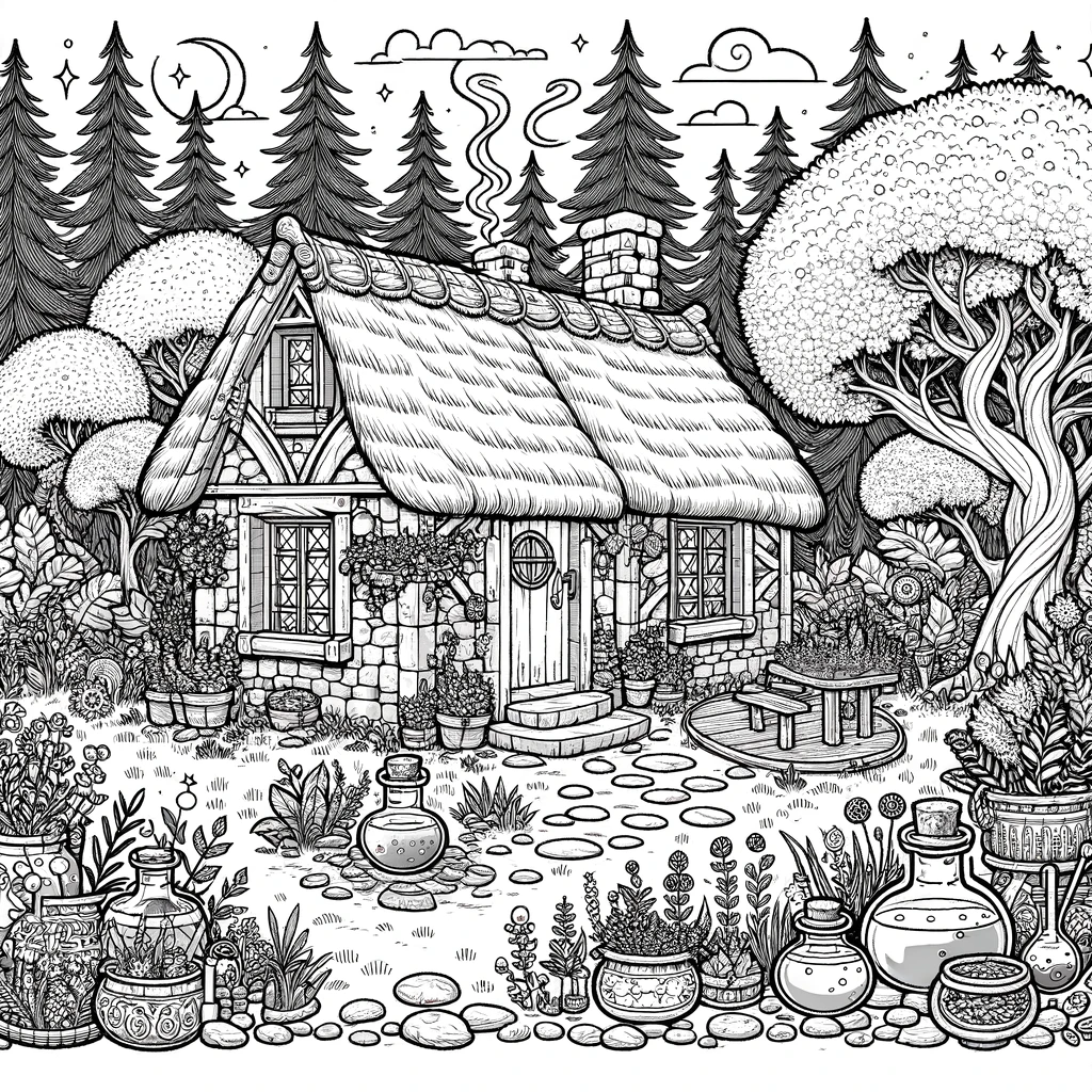 童話に出てきそうな、昔風のかわいらしい一軒家を描いたファンタジー塗り絵です。藁葺き屋根のコテージには煙突があり、壁にはツタや花が絡まっています。庭にはテーブルセットや井戸、魔法のポーションが入っていそうな瓶、色とりどりの花々や植物が所狭しと並び、まるで魔女や妖精が住んでいそうな温かみのある世界観です。