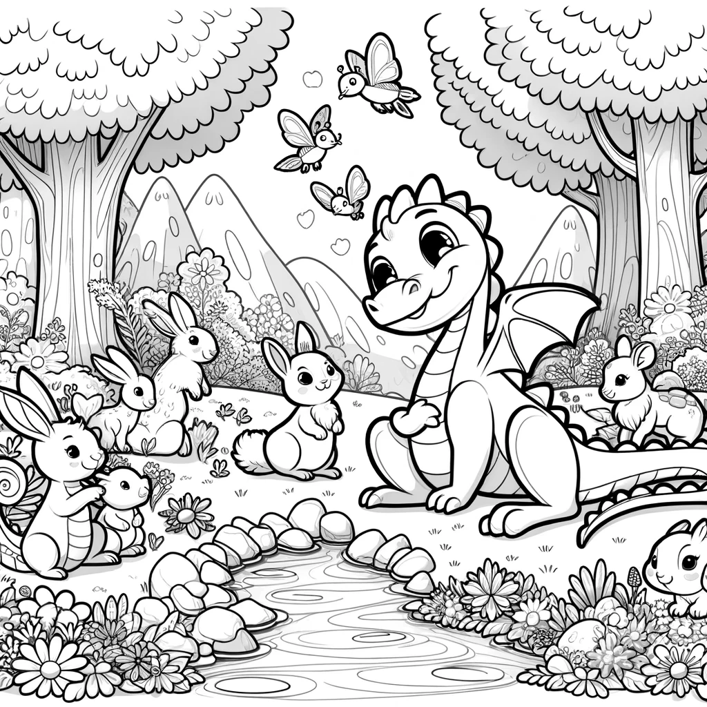 森の中で優しいドラゴンとかわいいうさぎたちが仲良く遊んでいる、心温まるファンタジー塗り絵です。にっこり笑顔のデフォルメドラゴンの周りに、たくさんのうさぎたちが集まっています。背景には大きな木々や山、小川が流れ、蝶々が舞う穏やかな風景。絵本の1ページのような、ほのぼのとした世界観をお楽しみいただけます。