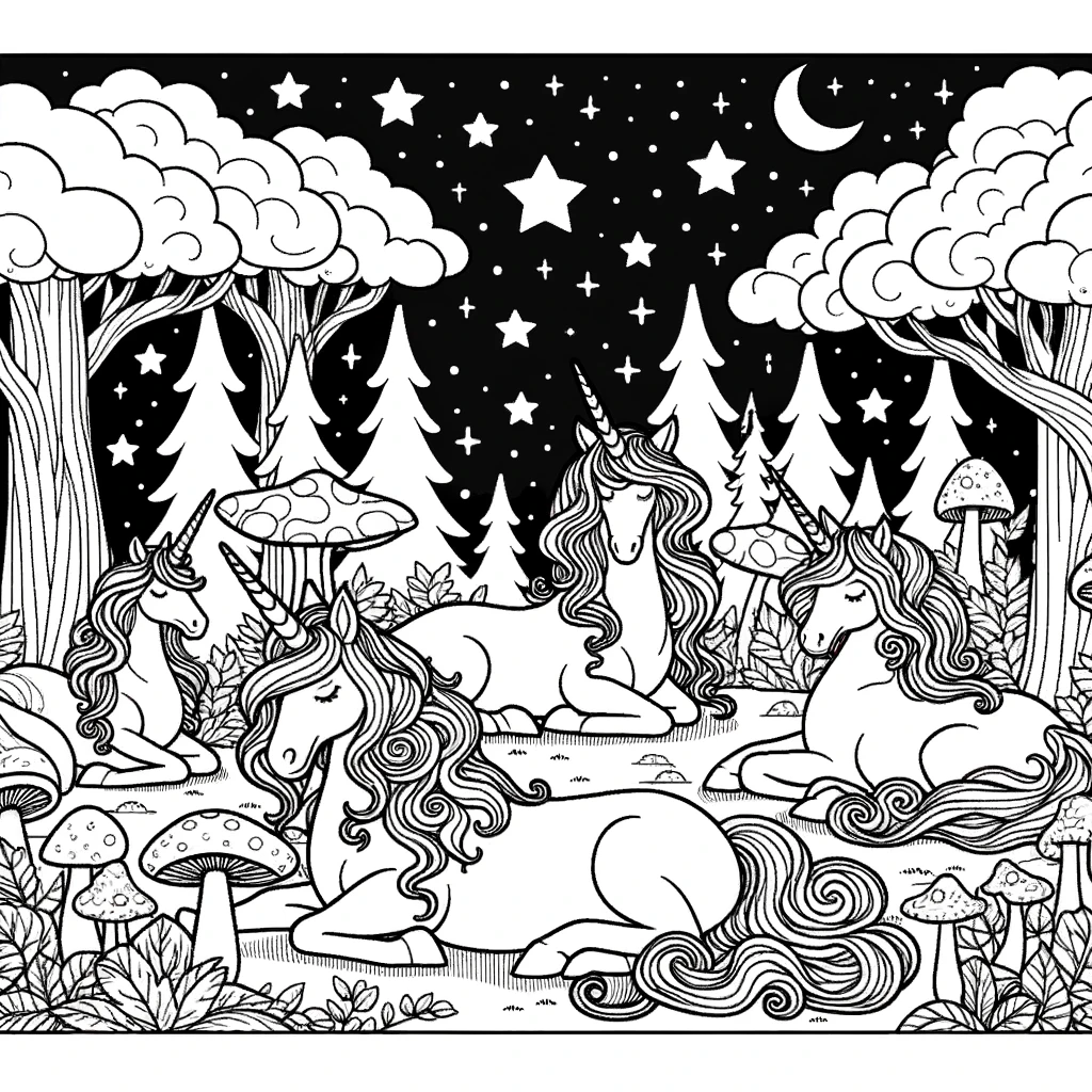 星が輝く夜の魔法の森で、ユニコーンたちが穏やかに休息している幻想的な塗り絵です。2頭のユニコーンが寄り添うように横たわり、流れるようなたてがみが美しく広がっています。周りには大きなきのこや針葉樹の森、ふわふわの雲が浮かび、きらめく星々が夜空を彩っています。静かで神秘的な夜の情景をお楽しみいただけます。