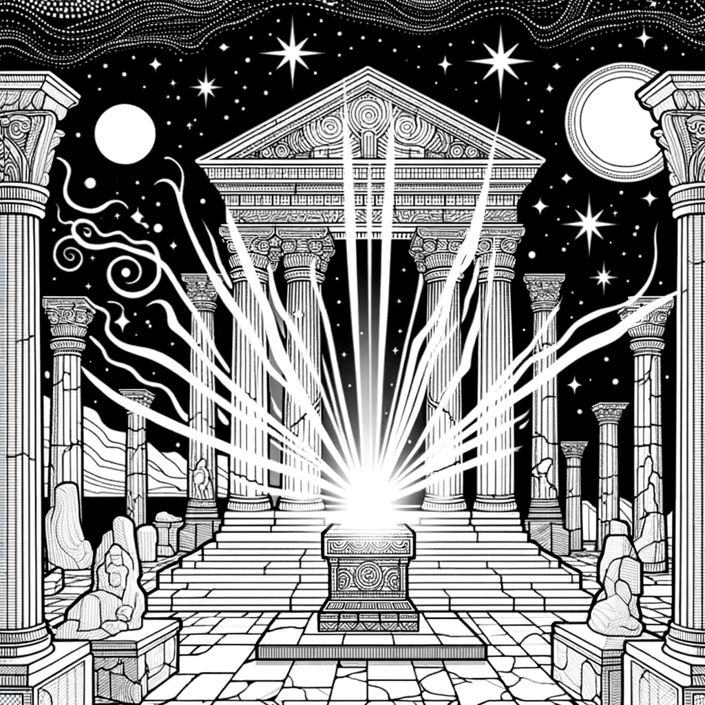 古代の魔法がかけられた神殿遺跡をイメージした、神秘的な塗り絵です。ギリシャ・ローマ風の荘厳な柱が立ち並ぶ中、中央の祭壇からは眩い光が天に向かって放たれています。満月と星々が輝く夜空の下、古代文明の神秘と魔法の力を感じさせる壮大な光景が広がっています。遺跡探検や古代ロマンが好きな方にぴったりの一枚です。