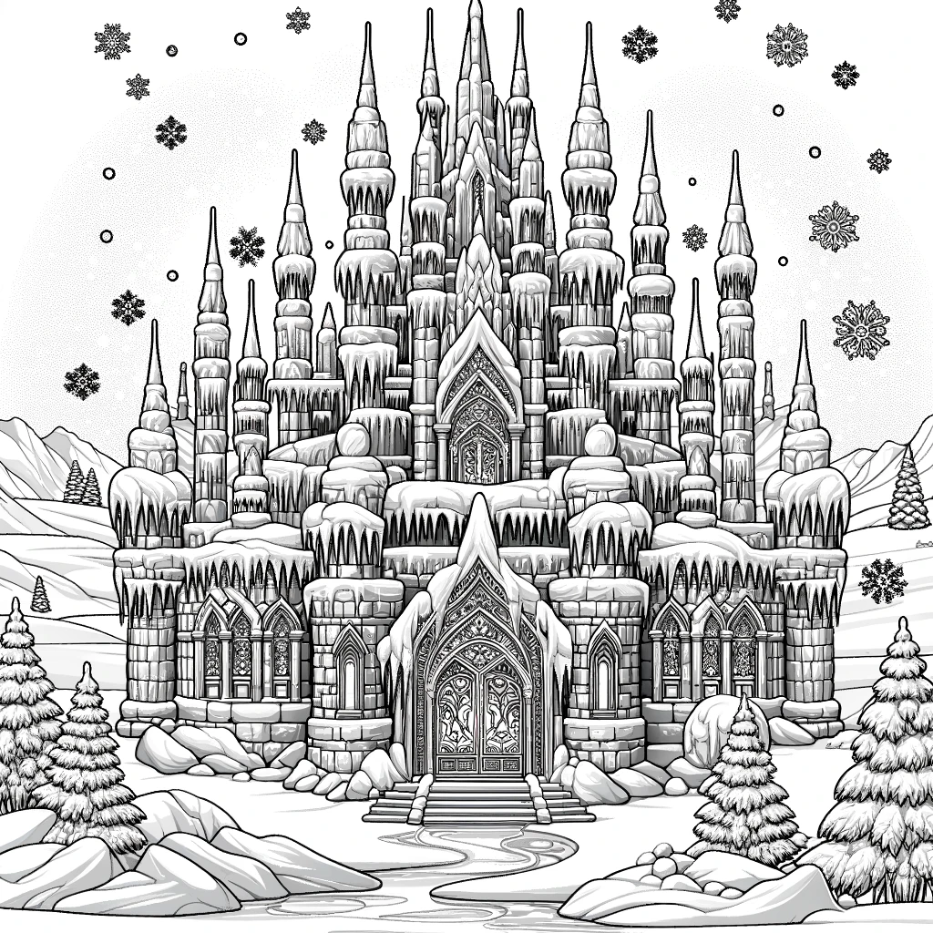 氷と雪に覆われた幻想的な冬の王国を描いた塗り絵です。凍てついた石造りの城には氷柱が垂れ下がり、尖塔には雪が積もっています。ゴシック様式の美しい窓や門が特徴的で、周囲には雪をかぶったモミの木が立ち並んでいます。空には雪の結晶が舞い、まるで「アナと雪の女王」の世界のような、美しくも厳かな冬景色が広がっています。