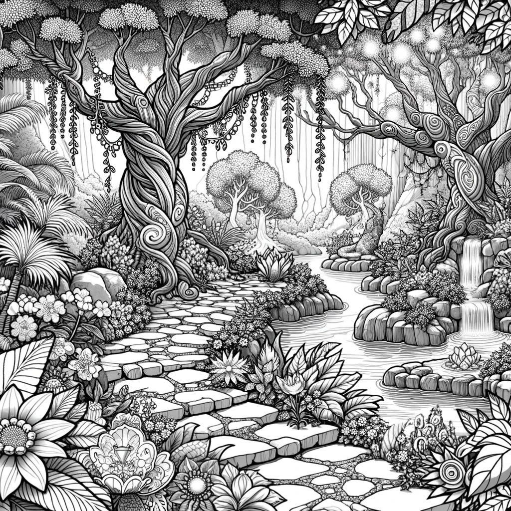 妖精が今にも出てきそうな、魔法に包まれた森を描いた塗り絵です。渦巻き模様の幹を持つ不思議な木々がそびえ、石畳の小道が森の奥へと続いています。右側には穏やかな滝が流れ落ち、池のほとりにはカエルの姿も。色とりどりの花々や草、垂れ下がるツタが生い茂り、まさに妖精の棲む楽園のような幻想的な風景です。