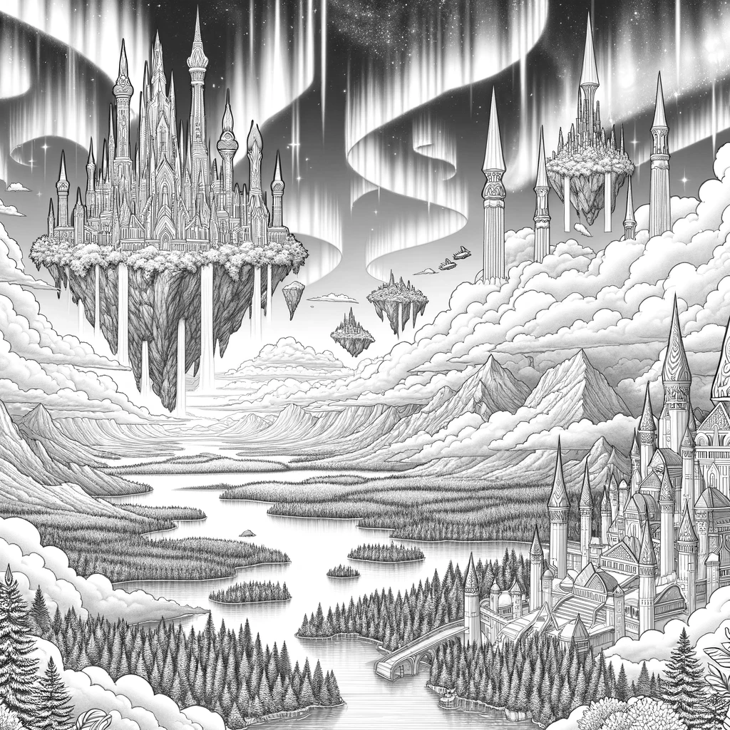 空中に浮かぶ島々と壮大な風景を描いた、スケール感あふれるファンタジー塗り絵です。宙に浮かぶ大小の島には城や塔がそびえ、オーロラのような光の帯が空を彩っています。地上には山々や森、湖が広がり、手前には荘厳な城が建っています。天空と地上の両方の世界が共存する、まさに異世界ファンタジーの壮大な光景です。