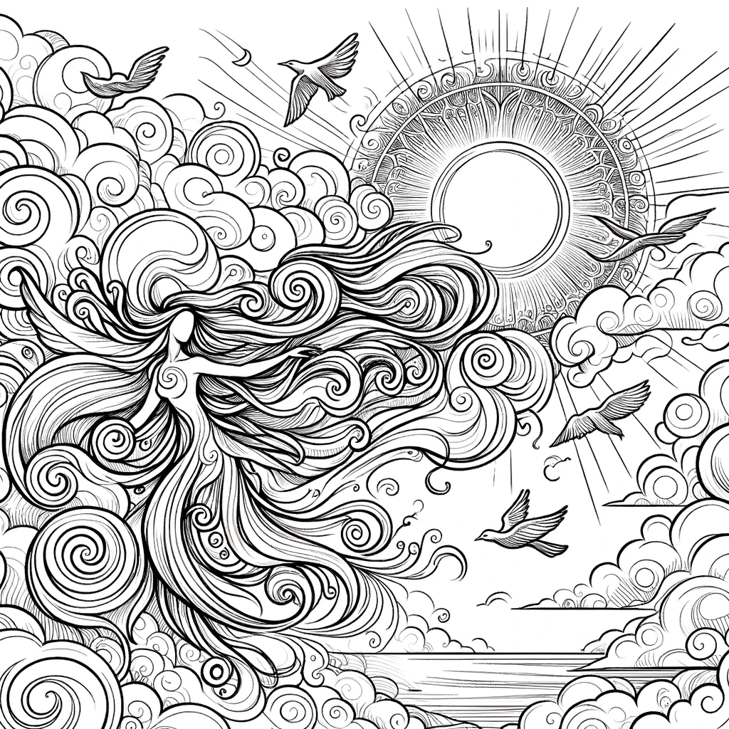 ファンタジー世界の空の精霊をイメージした、優美で流動的な塗り絵です。風そのものが女性の姿をとったような精霊が、渦巻く雲の中を自由に舞い踊っています。長い髪は風に乗って流れるように広がり、太陽が輝く空には鳥たちが飛び交っています。渦巻き模様の雲がダイナミックに描かれ、空気と風の流れを感じられる神秘的な一枚です。