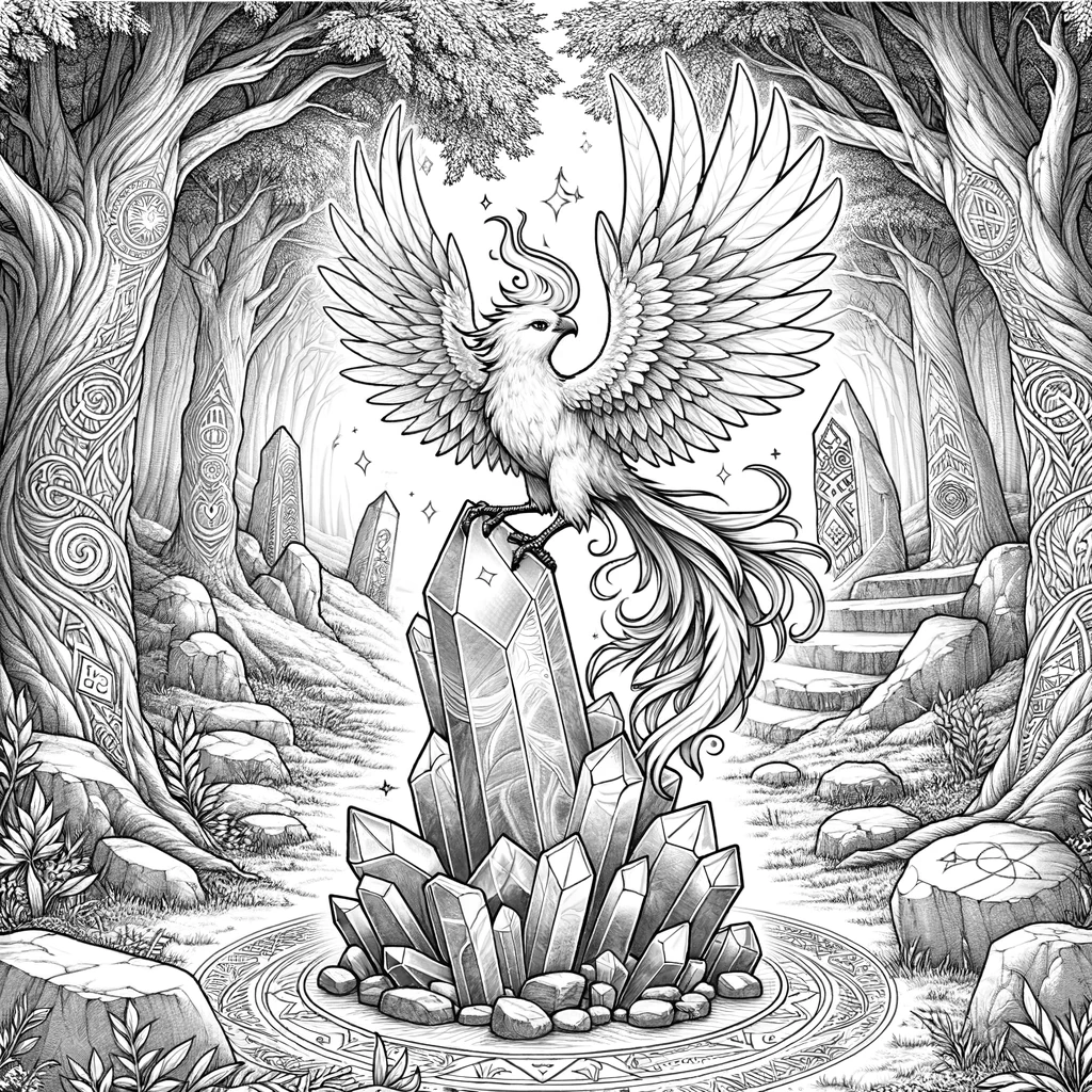 魔法の結晶にとまる若い鳳凰を描いた、神秘的なファンタジー塗り絵です。古代のルーン文字が刻まれた石碑が立ち並ぶ森の聖域で、大きな水晶の上に若々しい鳳凰が羽を広げています。まだ成長途中の美しい羽毛と、くるんとカールした冠羽が愛らしく、周囲にはキラキラと魔法の光が舞っています。神秘と自然が融合した、幻想的な世界観の一枚です。