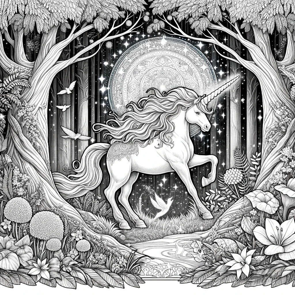 神秘の森の中を歩くユニコーンを描いた、幻想的なファンタジー塗り絵です。優雅にたてがみをなびかせたユニコーンが、星がきらめく夜の森を進んでいます。背景には美しい装飾模様の円形マンダラが浮かび、古木に囲まれた神聖な空間が広がっています。鳥たちが飛び交い、シダや花々が茂る、まさに魔法が宿る森の深部を思わせる一枚です。