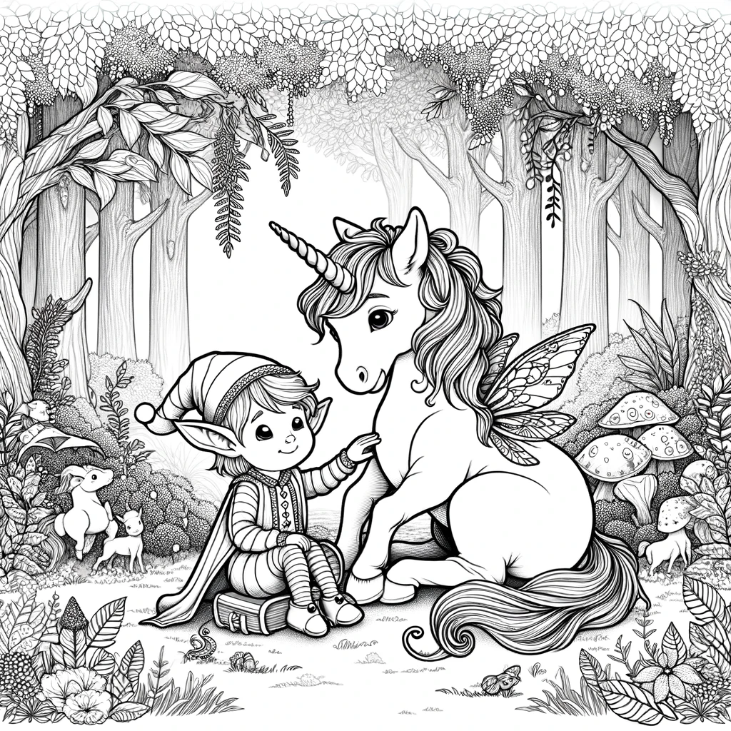 デフォルメされたかわいいユニコーンと妖精の出会いを描いた、心温まるファンタジー塗り絵です。大きな瞳のユニコーンに、とんがり帽子をかぶった小さなエルフの男の子がそっと手を伸ばしています。森の中にはうさぎやきのこ、草花が描かれ、まるで絵本の1ページのような優しい世界観。友情の始まりを感じさせる、ほのぼのとした一枚です。