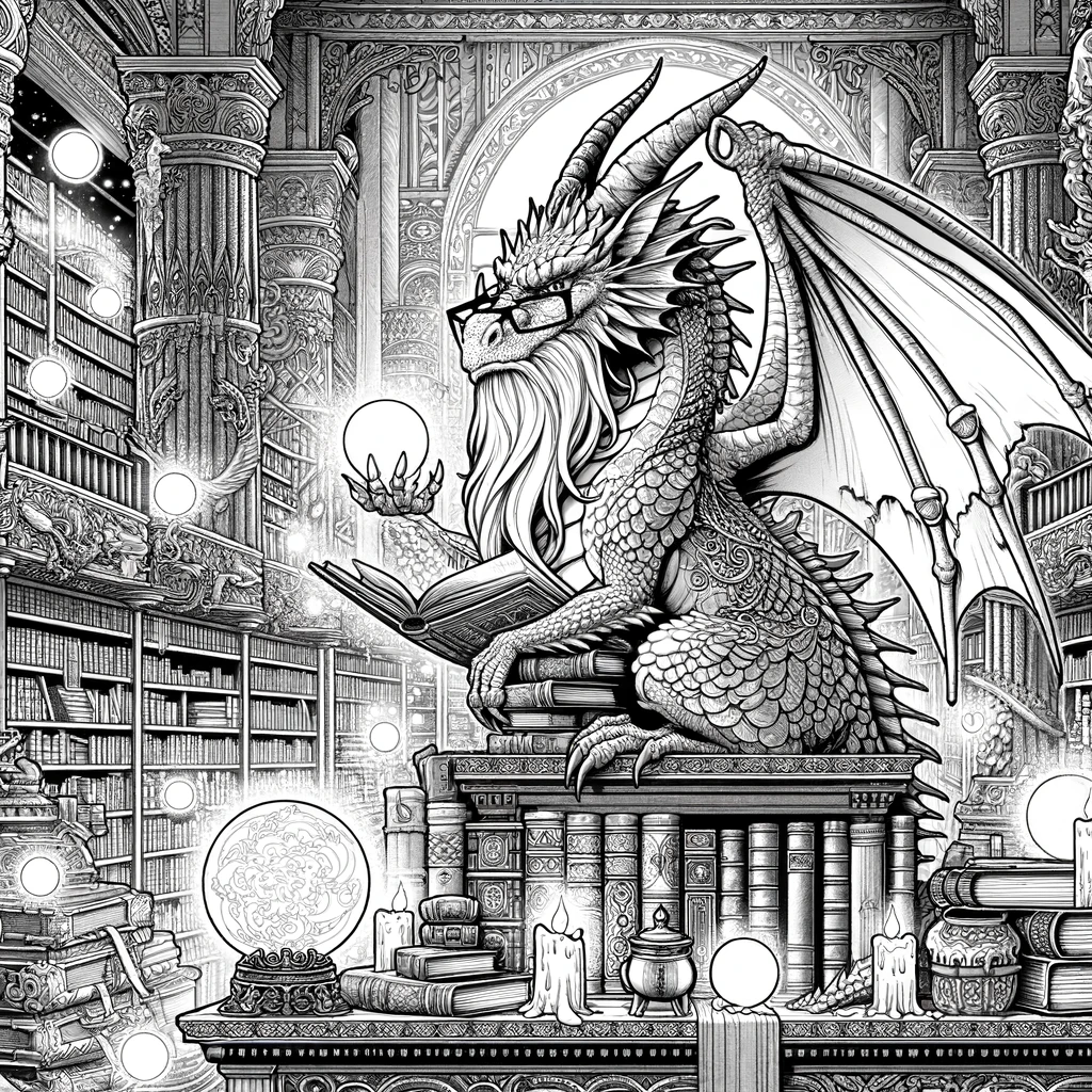ドラゴンが書庫で魔法を研究している、ユニークで知的なファンタジー塗り絵です。なんと眼鏡をかけた学者ドラゴンが、山積みの本の上に座り、片手に魔導書、もう片方の手に光る魔法の球体を持って研究に没頭しています。壮大な図書館には天井まで届く本棚、輝くシャンデリア、ゴシック様式の装飾が広がり、知恵と魔法が融合した世界観が楽しめる一枚です。