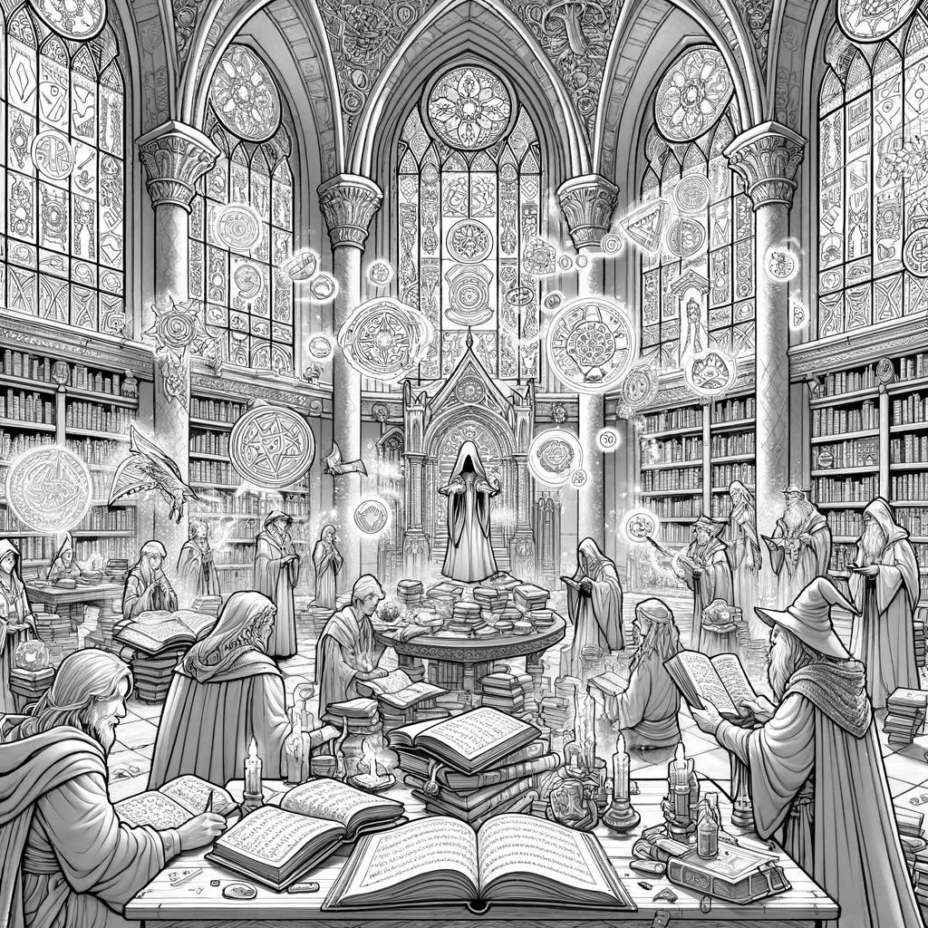 魔法使いたちによる魔法研究を描いた、壮大なファンタジー塗り絵です。荘厳な魔法学院の大広間で、多くの魔法使いたちが魔導書を読み、研究に励んでいます。中央では一人の魔法使いが儀式を行い、空中には魔法陣や古代のシンボル、光り輝くルーンが浮かんでいます。高い天井のステンドグラス、本棚、ゴシック様式の柱が魔法学院の威厳を感じさせる一枚です。