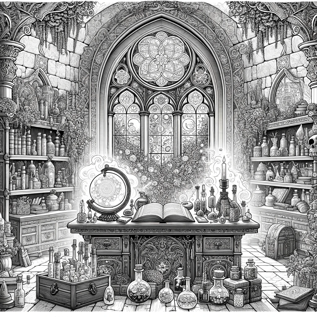 魔法使いの部屋をイメージした、細部まで描き込まれたファンタジー塗り絵です。ゴシック様式の美しいステンドグラス窓から光が差し込む石造りの部屋には、開かれた魔導書、天球儀のような魔法の道具、キャンドルが置かれた机があります。棚にはポーションの瓶がびっしりと並び、天井からはドライハーブが吊るされています。窓辺にはバラが咲き誇り、魔法と自然が調和した魔術師の理想の書斎です。