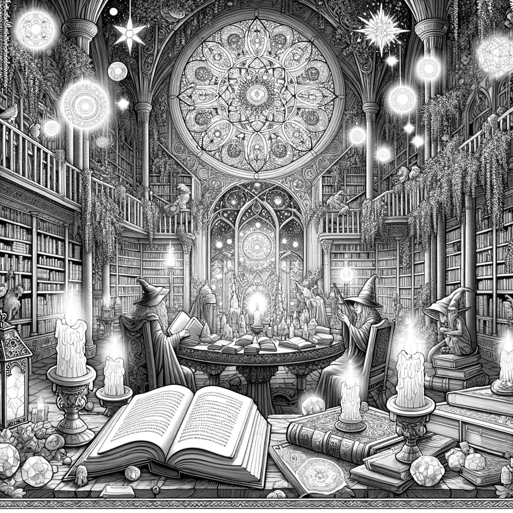魔法使いたちが会議のような打ち合わせをしている、壮大なファンタジー塗り絵です。荘厳な魔法図書館の中、丸テーブルを囲んで複数の魔法使いたちが魔導書を広げ、議論を交わしています。高い天井にはステンドグラスと魔法の光が輝き、壁一面の本棚には無数の古書が並んでいます。垂れ下がるツタ、灯るキャンドル、浮かぶ光球が神秘的な雰囲気を演出する、魔法評議会のような一枚です。