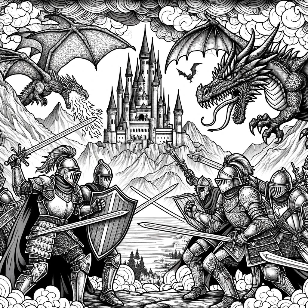 騎士たちがドラゴンを使って戦っている、迫力満点のファンタジー塗り絵です。剣と盾を持った騎士たちが激しくぶつかり合い、空には巨大なドラゴンたちが舞っています。背景には荘厳な城がそびえ、山々が連なる壮大な戦場。ドラゴンが飛び交う中、中世ファンタジーの大戦争が繰り広げられています。RPGやファンタジー映画のクライマックスのような、ドラマチックな一枚です。