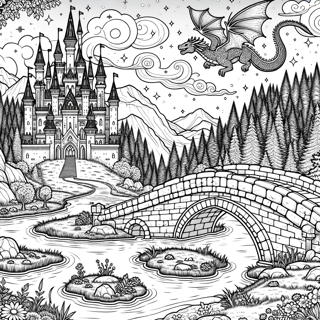 いくつもの尖塔がそびえる壮大な古城と、空を悠然と飛ぶドラゴン。手前には美しいアーチ型の石橋が川に架かり、その向こうには深い針葉樹の森と雄大な山々が連なります。渦巻く雲ときらめく星が、魔法に満ちた王国の夜明けを演出しています。