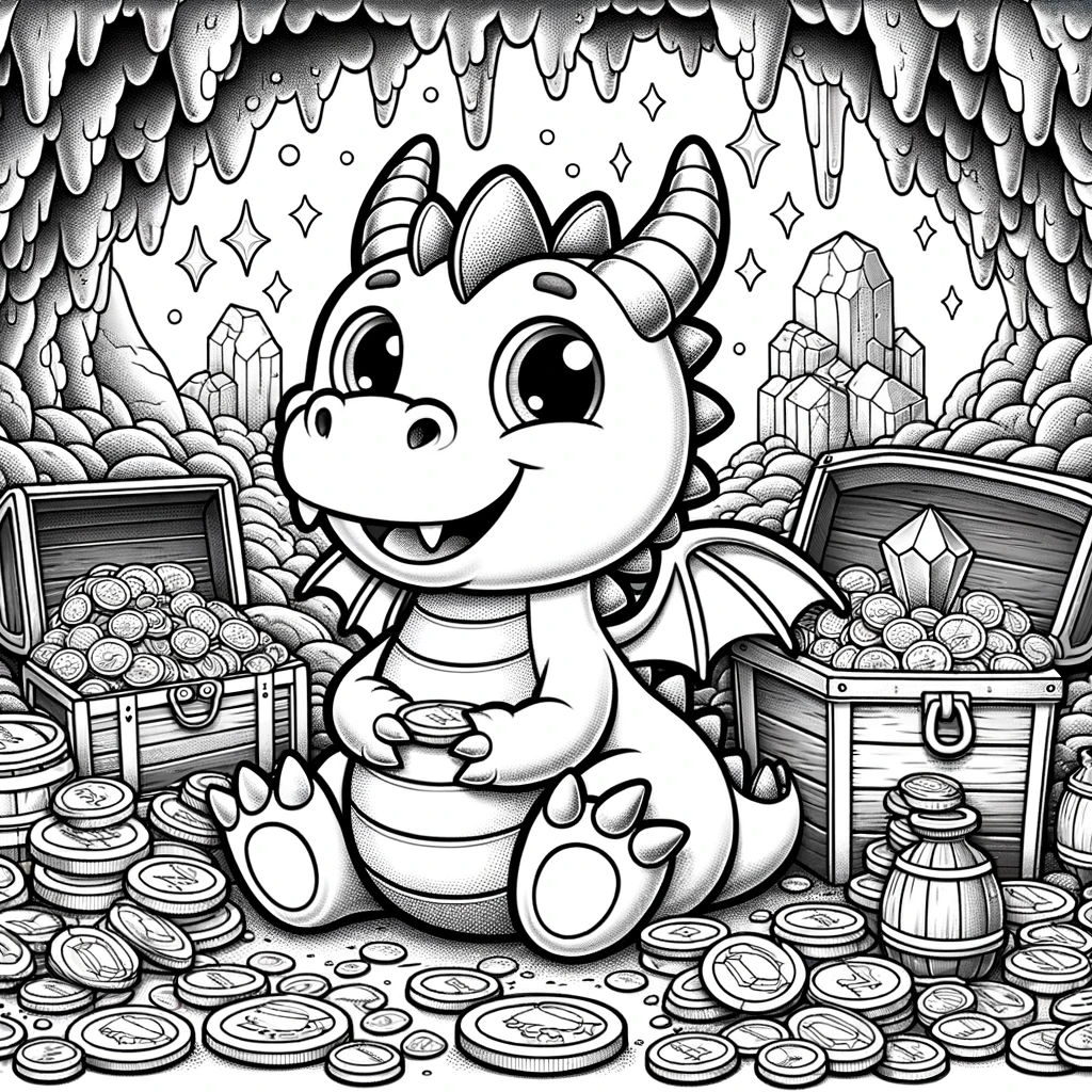 ちびドラゴンと宝の洞窟塗り絵|キラキラ輝く秘密のお宝部屋