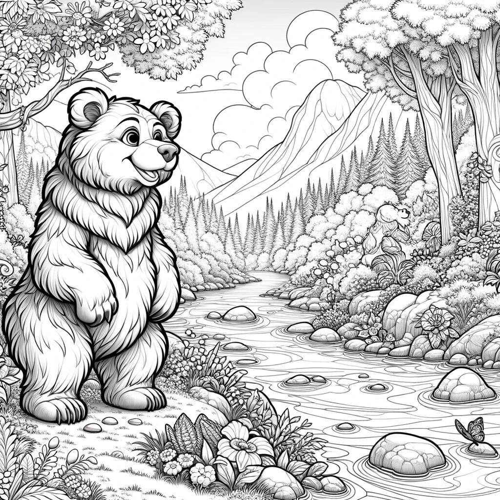ふわふわの毛並みが愛らしいくまさんが、小川のほとりでのんびり座っています。背景には雄大な山々と針葉樹の森が広がり、川のせせらぎが聞こえてきそうな穏やかな風景。足元には可愛い花々が咲き、蝶々がひらひらと舞う、心温まる森の一場面です。