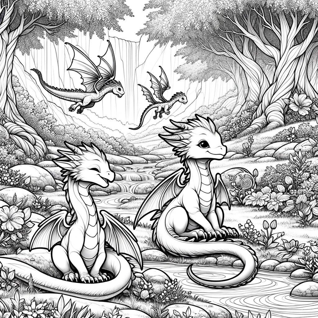 美しい滝が流れ落ちる森の中で、可愛らしいちびドラゴンたちが楽しそうに過ごしています。水辺でくつろぐ2匹と、空を元気に飛び回る2匹。花々が咲き誇り、大きな木々に囲まれた穏やかな楽園は、まるでドラゴンたちの秘密の遊び場。カタツムリもひょっこり顔を出す、ほのぼのとした風景です。
