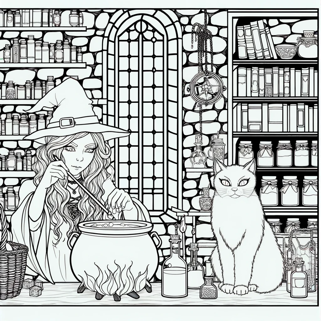 石造りの壁に囲まれた古い塔の一室で、魔女が真剣な眼差しで大鍋をかき混ぜています。ゴシック様式のアーチ窓から柔らかな光が差し込み、壁には魔導書やポーション瓶がびっしり。五芒星のペンダントが揺れ、傍らでは使い魔の白猫がじっと見守っています。中世の魔法使いの研究室を思わせる、本格的なファンタジーの一場面です。