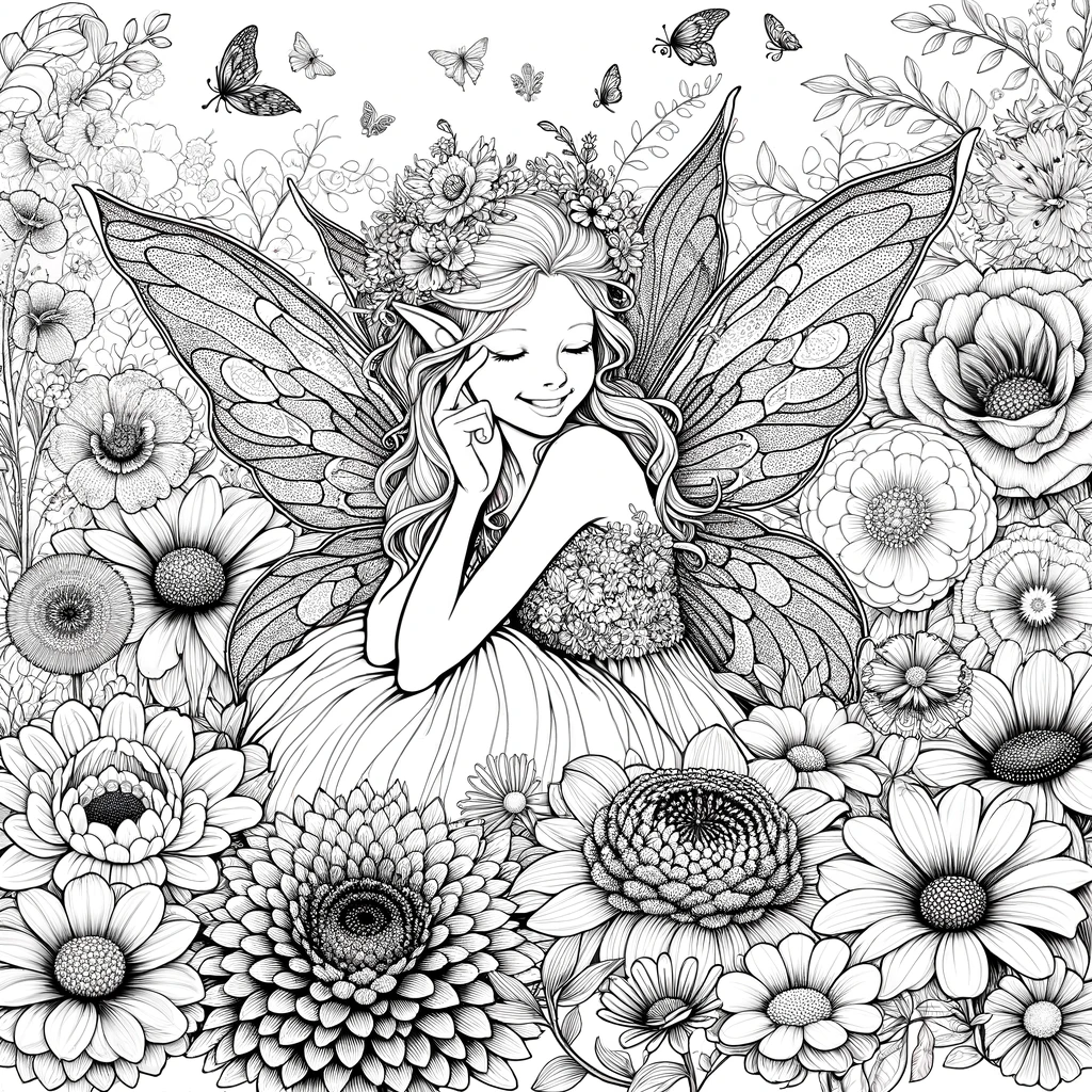ふわりと広がる花びらのドレスを身にまとった妖精が、満開の花々の中で幸せそうに微笑んでいます。繊細な模様が美しい蝶の羽、花冠と小花で飾られた髪、胸元を彩る紫陽花のようなコサージュ。たくさんの蝶々が祝福するように舞い踊り、大輪の花々が咲き誇る、夢のように美しい花園の一場面です。