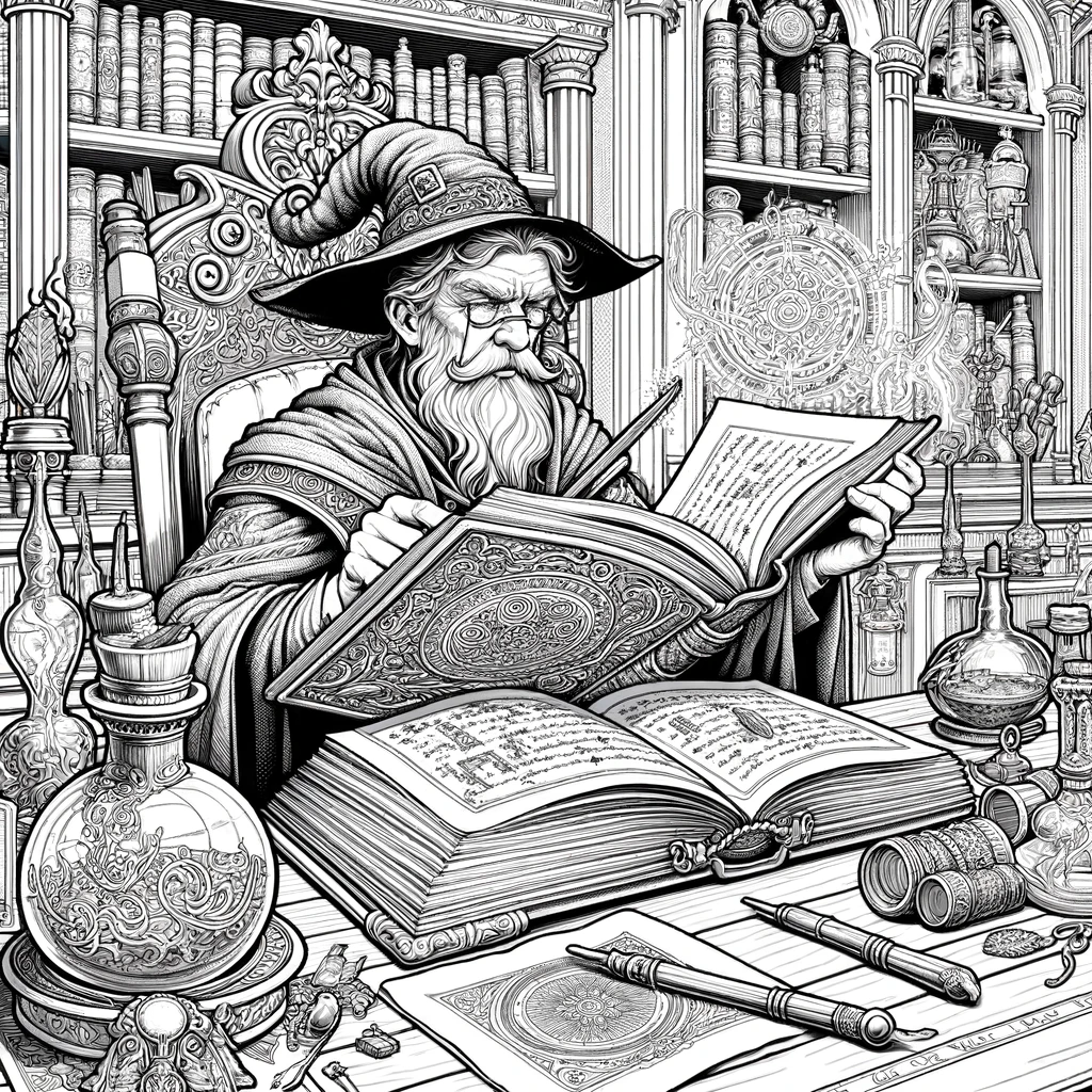 大魔法使いの書斎塗り絵|古の魔導書を紐解く賢者の研究室