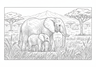 草原を歩くアフリカゾウの親子のぬりえ【無料ダウンロード】