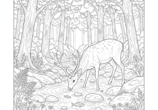森の小川で水を飲む鹿のぬりえ【無料ダウンロード】