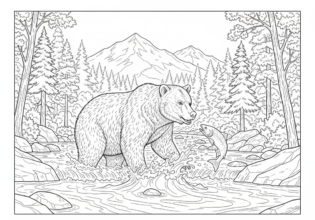 川で鮭を捕るクマのぬりえ【無料ダウンロード】