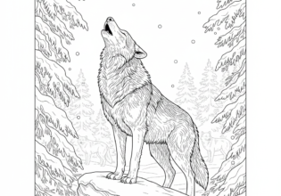 雪の森で遠吠えするオオカミのぬりえ【無料ダウンロード】