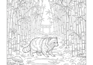 竹林の中のタヌキのぬりえ【無料ダウンロード】