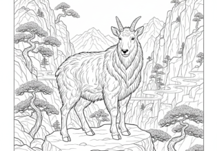 山の岩場に立つニホンカモシカのぬりえ【無料ダウンロード】