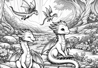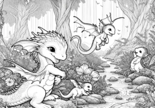 ドラゴン一家の小川遊び塗り絵|花咲く森で元気に遊ぶ赤ちゃんドラゴン