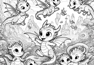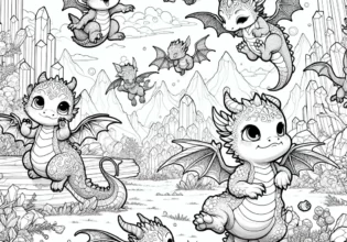 ちびドラゴン大集合塗り絵|クリスタルの谷で遊ぶ元気な仲間たち